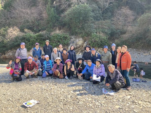 2026 0214 田辺ジオパーク研究会 第57回 公式巡検見学会でした。滝尻に9時に集合。今回は久しぶりですが、中屋先生主催の本宮ジオツアーで、テーマは川の構成の歴史・本宮温泉郷の湧出の地質的考察・環流丘陵の考察でした。最初は大居集落付近の熊野川の流れの考察より、この集落に長い間に形成されたポイントバー(蛇行州)の歴史を観察しました。時系列は何万年という単位ですが、鍵層として助けになるのは姶良火山灰層(2万8000年前後)だとの力説でした。その他、寄州(よりす)の形成、三越(みこし)川の流路の歴史による貫通丘陵、等。大斎原(おおゆのはら)の前の河原でランチ、その後、河原の岩石の観察(砂岩礫、チャート礫等)。請川・高山には行けず。次は川湯温泉、大塔川(仙人風呂)の真下に石英斑岩の岩脈があり、その割れ目から河床堆積物の間隙を通って温泉が湧出しています。この石英斑岩の岩脈がキー、硬くて温泉の湧出路が石英斑岩にできるとほぼ半永久的な温泉の湧き口ができるらしい。湯筒の観察、間欠温泉、つぼ湯、ユノミネシダと続き、最後は皆地の環流丘陵の観察で、共役の力により北西・南東の方向に丘陵が形成されている、等の内容でした。16:30滝尻での解散、お疲れ様でした。