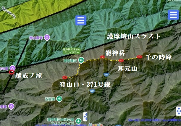 護摩壇山スラストに沿って歩いたことになります。予定していた「越戒の滝」は護摩壇山スラスト直下に存在刷る模様です。(耳元山は耳取山の間違い)