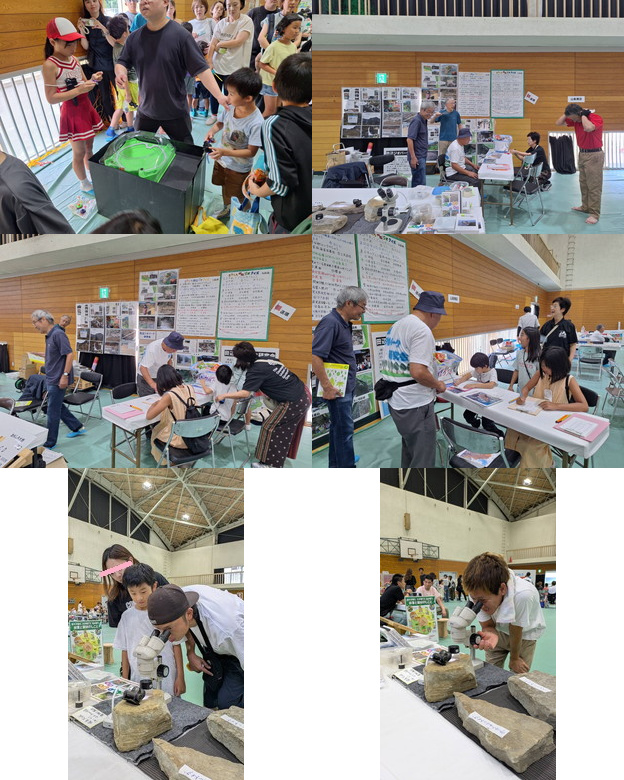 壁に、皆で修理したパネルを貼り、見やすい所にお菓子、解答用紙を置き、生痕化石を並べ顕微鏡やライトを設営し(弓場さん主導)、三栖さんお手製の木の素敵な書見台に説明をのせて準備完了。顕微鏡を覗いたり化石に見入ったりと老若男女を問わず来客多数。