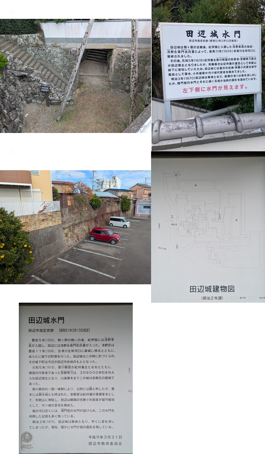 明治3年(1870) 田辺城は廃城となり、 遺構の多くは姿を消しましたが、埋門型の水門とそれに続く石垣が当時の面影を留めています。