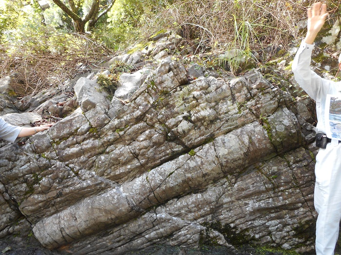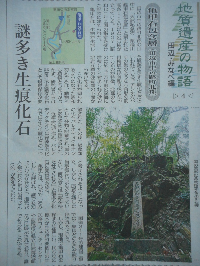 和歌山県田辺市中辺路町北郡の亀甲包含層1937年(昭和12年)国の天然記念物指定 ここは、約5000万年前の深海に堆積した砂岩泥岩互層の地層といわれる