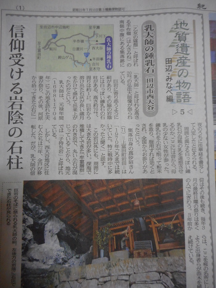 乳大師の鍾乳石 和歌山県田辺市西大谷この集落は今から45年前に全戸が移転している。それでも乳大師の信仰は今でも続き、毎年3月最終日曜に祭りで賑わっています。ここは、2011年紀伊半島大水害で大規模な土石流も発生していますが、元住民の方々が数年前から併せて約1,000本の桜が植樹されているところです。
