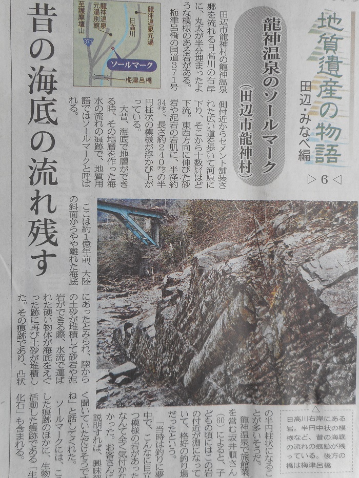 和歌山県田辺市龍神村のソールマーク龍神温泉を流れる日高川右岸側にお菓子のピッコロのような形をした岩がある。大昔、海底で地層ができる時、水流で運ばれてきた硬い物体が海底をえぐった跡に再び土砂が積ったとみられる痕跡です