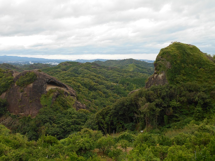 大坊の大天井岩(田辺市芳養町)表皮が薄く小粒の甘いミカン産地として有名な地域です。山頂附近から眼下の木々の間に、屏風のような大岩が異彩をはなっています。西天井(向かって右側)と東天井と呼ばれるようです。