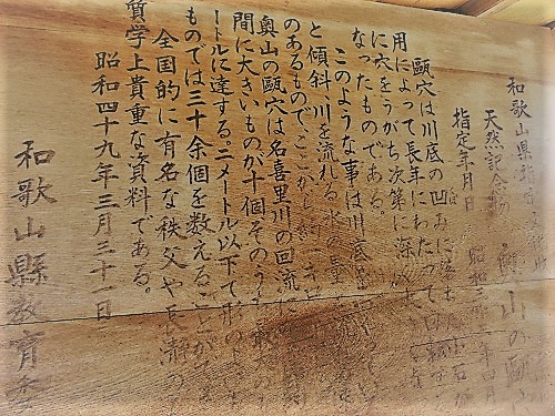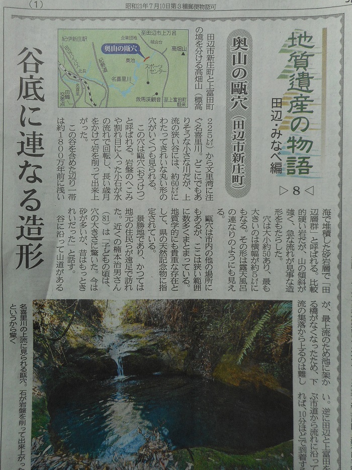 奥山の甌穴(田辺市新庄町)田辺市と隣り町(上富田町)の境界近くを流れる、小さな名喜里川(なきり川)上流に大小数多くのポットホールができている。約1800万年前に浅い海で積もった砂岩層に五右衛門風呂のような大きなものもあり、