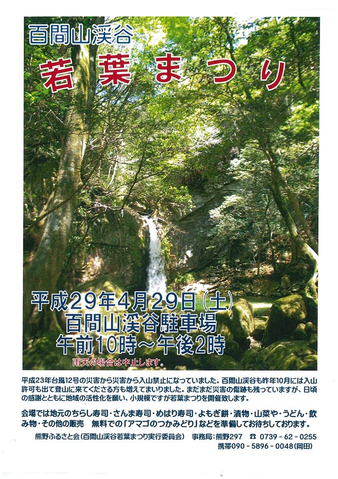 4月29日田辺市大塔の百間渓谷「若葉まつり」お知らせ