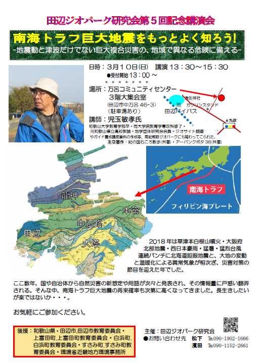 当日は、田辺ジオパーク研究会会員が其々にご案内します。ご一緒にお弁当を楽しみましょう!! 詳細はチラシをご覧下さい。
