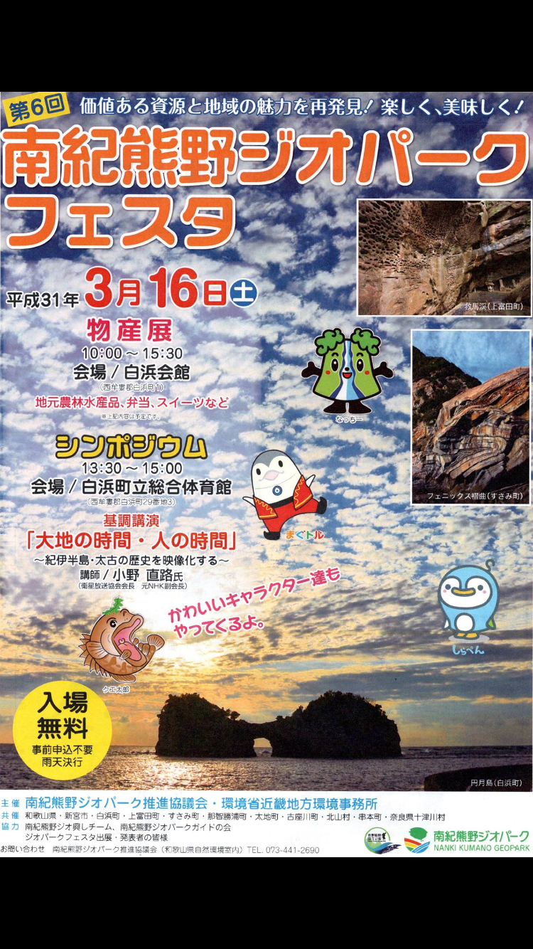 2019年3月16日(土)10:00〜15:30第6回南紀熊野ジオパークフェスタが開催されます。