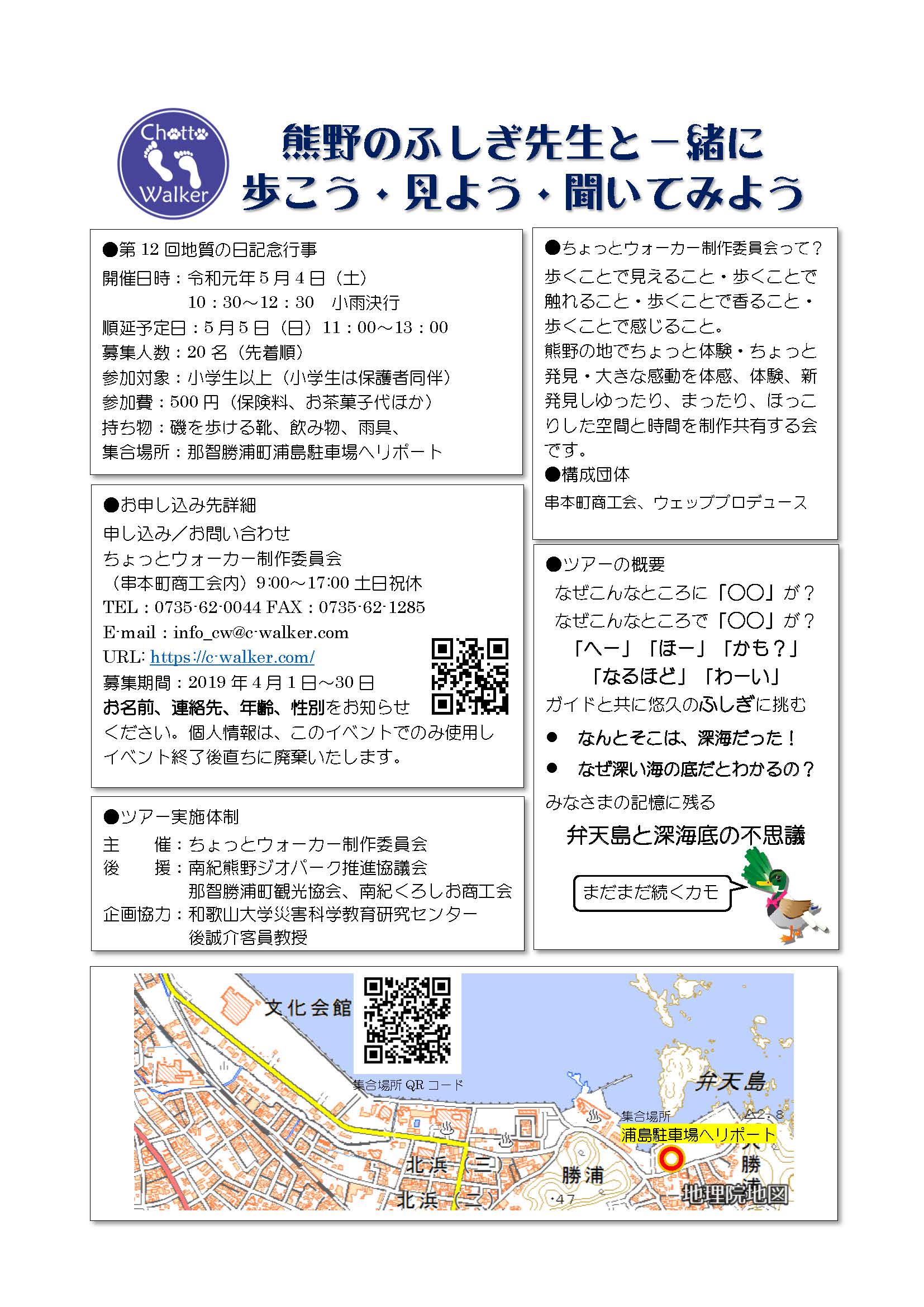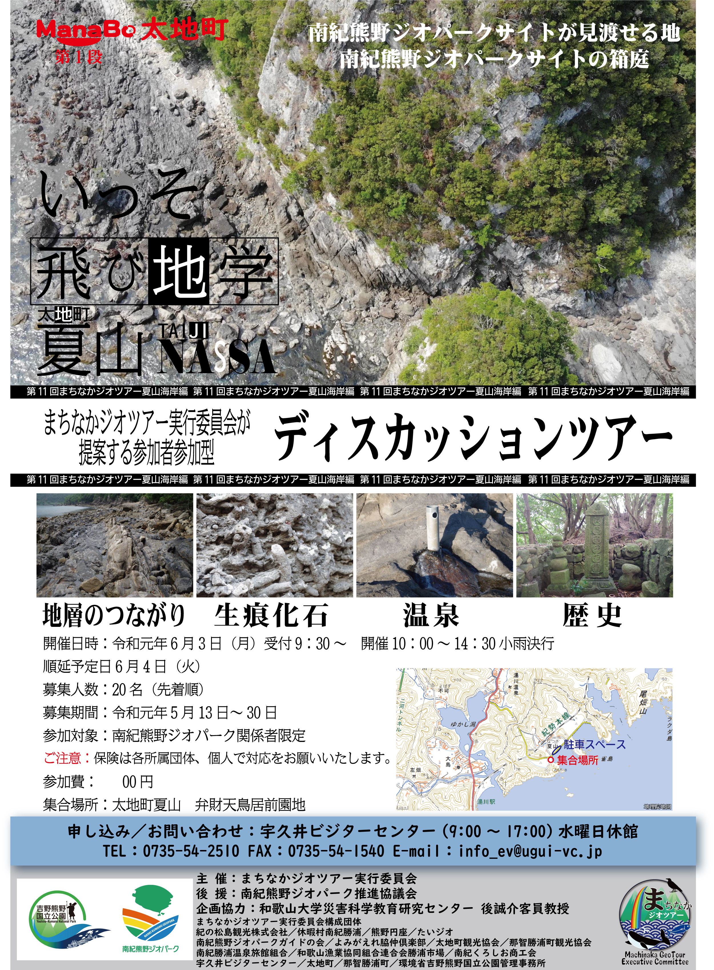 2019年5月4日ゴールデンウィーク後半に、那智勝浦の弁天島でも地質の日関連のイベントが行われます(詳細はチラシをご覧ください)5月10日は地質の日です。